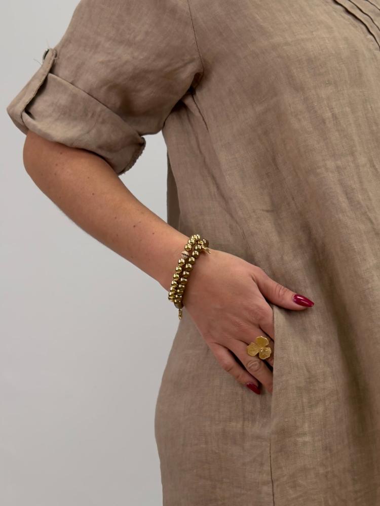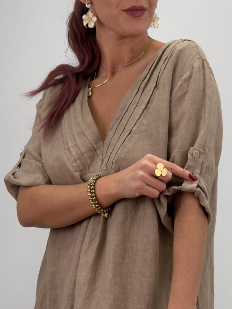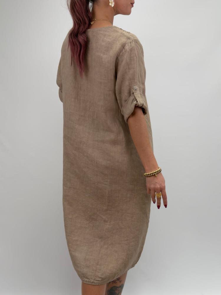Mångsidig linneklänning med rejäl vidd, i jordnära taupe. Sydda dekorativa veck i v-halsen och knappslå på ärmen - vilket gör det möjligt att ha ärmen antingen uppvikt eller fäst med knapp. Fickor i sidan är ett stort plus!
