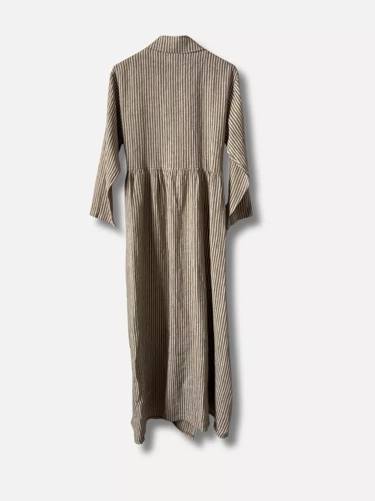 En fantastiskt snygg lång klänning i linne, med skjortkrage och lång ärm. Knyt i ena sidan och fickor i båda sidor. Randig i brunt och offwhite.