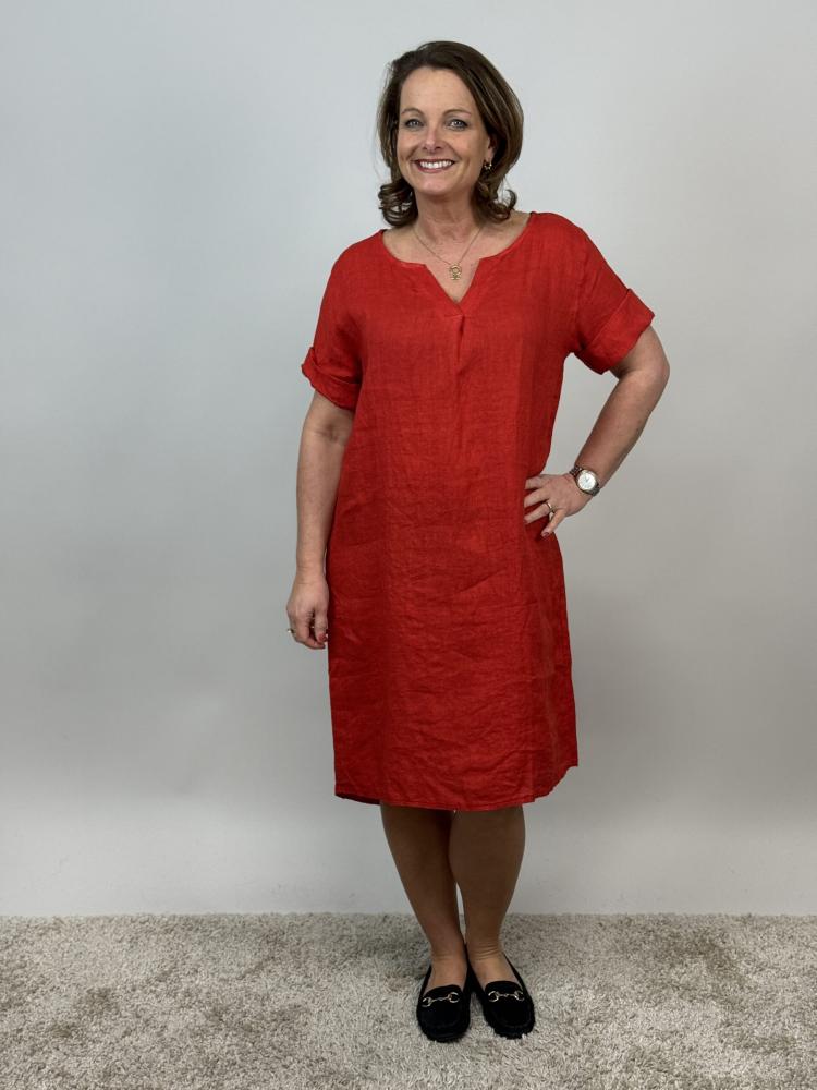 Röd linneklänning med v-hals och kort ärm med uppvik.