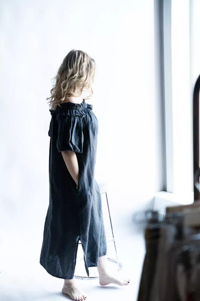 En luftig och böljande linneklänning med generös singoallaringning som kan bäras både uppdragen och nedhasad över axlarna. Rynkningen i halsen ger plagget karaktär och skapar ett levande uttryck, medan den korta ballongärmen tillför en feminin siluett. Slitsar i sidorna ger extra rörelsefrihet och ett fint fall. En klänning som känns lika självklar till vardags som till somriga tillfällen.