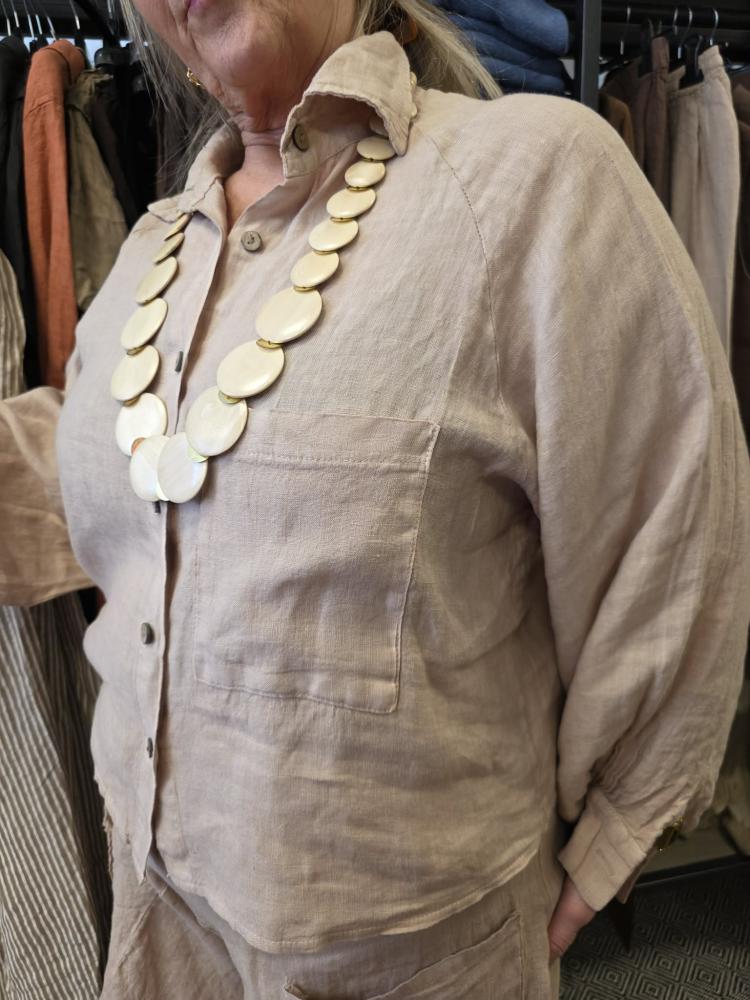Härligt vid och skön sandfärgad skjorta i 100% linne. Krage, helknäppt, en bröstficka samt med en lite "boxig" ärm som avslutas med en manschett.