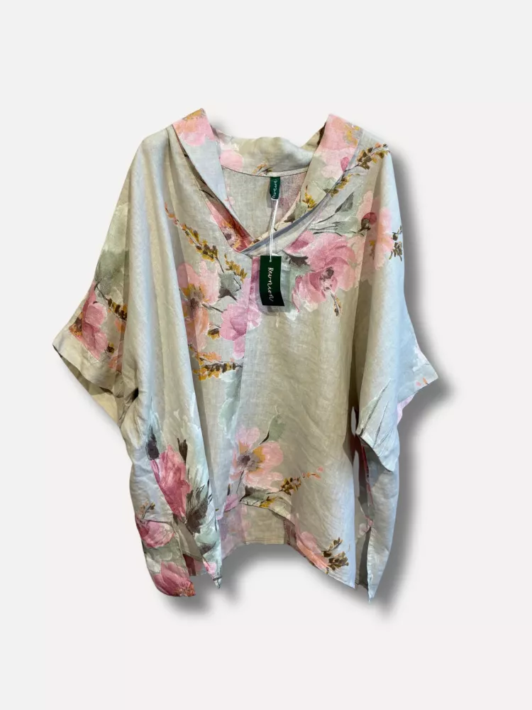 Fin oversize linneblus med rejäl vidd, Beige med stora blommor i rosa nyanser - Dubbelstorlek (M/L och XL/XXL)