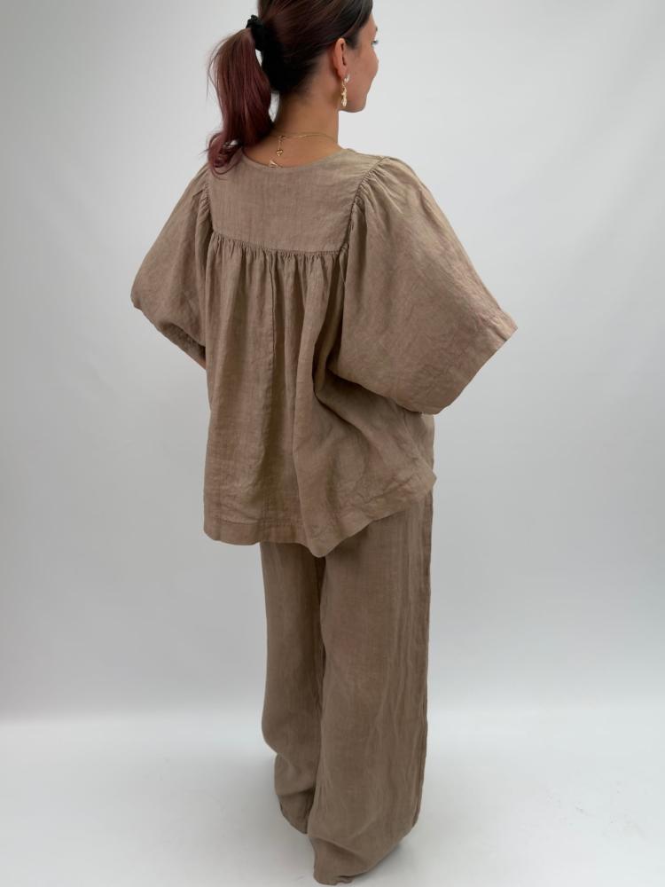 Trevlig blus i linne i en jordnära och mjuk taupefärg, med dekorativ söm kring v-ringningen. Kort ärm med bra vidd. Rynk vid ärm samt byst, ger en bohemisk look - men ger även rejäl vidd. Luftig och skön varma dagar.