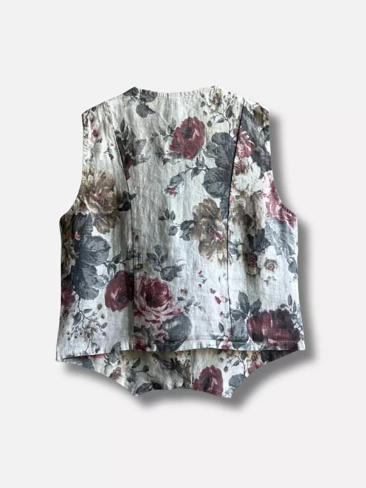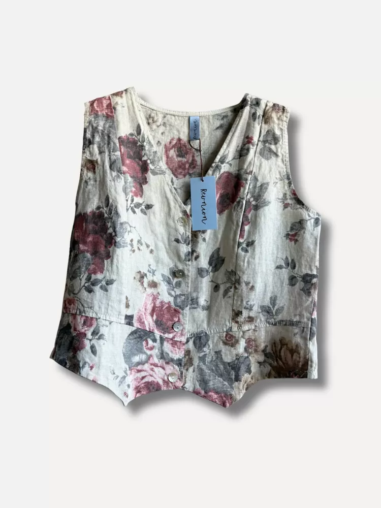 En snygg och avslappnad linneväst med klassiskt blommigt mönster som hämtat ur en engelsk tapetkatalog. Modellen har V-ringning och knäppning framtill med dekorativa knappar i pärlemor som ger ett genomarbetat och elegant intryck. Västen är lätt att bära och fungerar perfekt både som ett stilfullt lager över skjorta eller klänning, eller som ett statementplagg för sig själv under varmare dagar.
