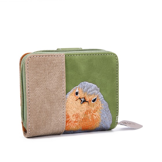 En nätt och praktisk plånbok i grön och beige ton med broderi av en baby-rödhake. Liten i formatet men smart i innehållet, med gott om plats för kort och lätt att bära med sig överallt.