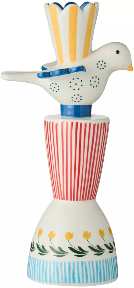 En lekfull och dekorativ ljusstake i keramik som verkligen drar blickarna till sig. Den färgstarka utformningen med fågelmotiv och handmålad känsla gör den till en personlig inredningsdetalj som passar perfekt i fönstret, på ett sideboard eller som en del av en kreativ dukning. Ljusstaken tillför värme, färg och karaktär och är lika fin ensam som tillsammans med andra ljusstakar.