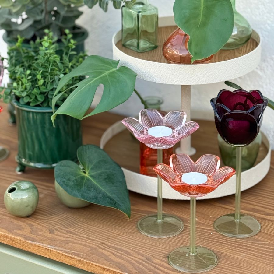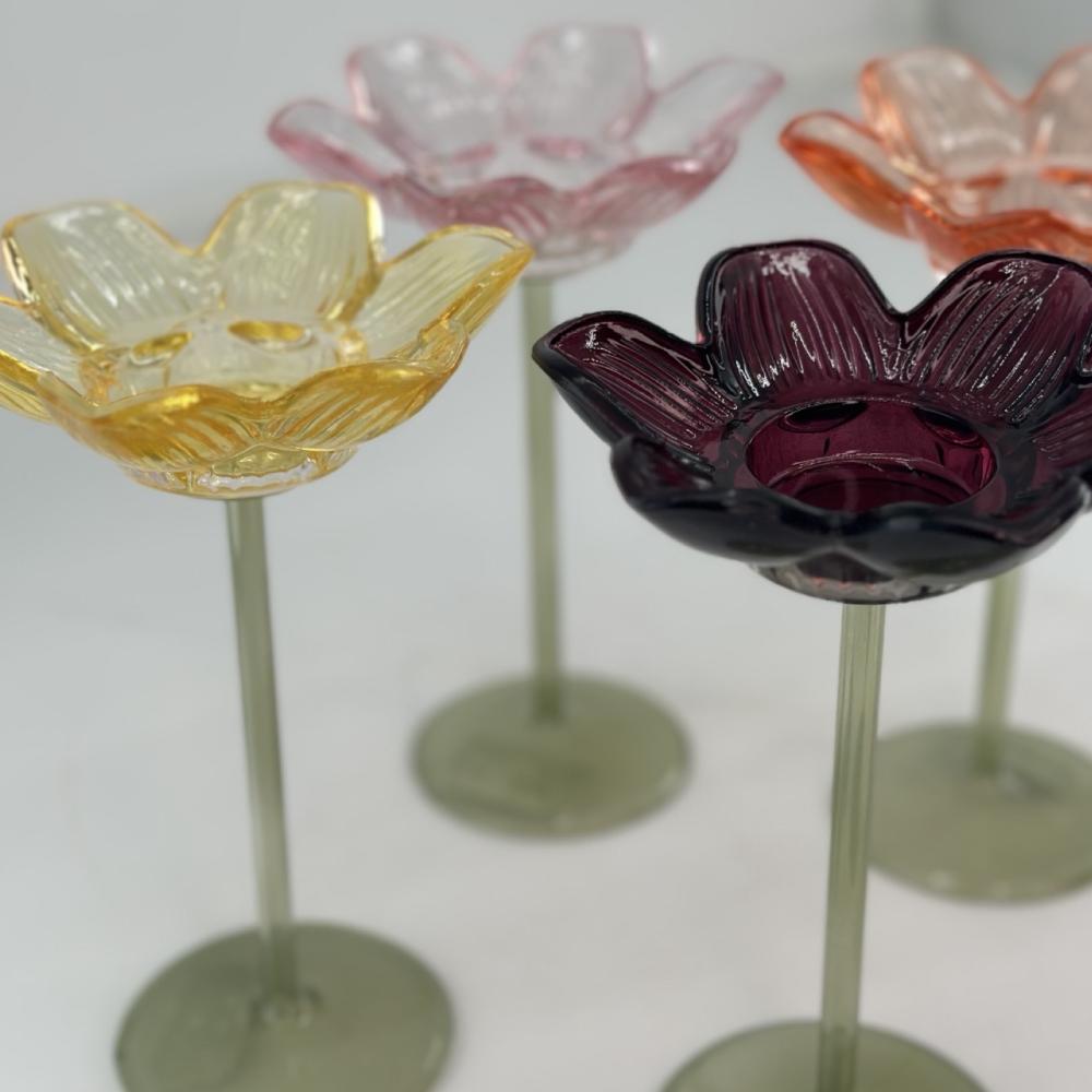 Ljusstake på fot, avsett för värmeljus. Gul blomma med öppna kronblad, där du placerar värmeljuset, stående på en grön stjälk med fot. Dekorativt att sätta flera tillsammans - Olika höjder och olika färger.