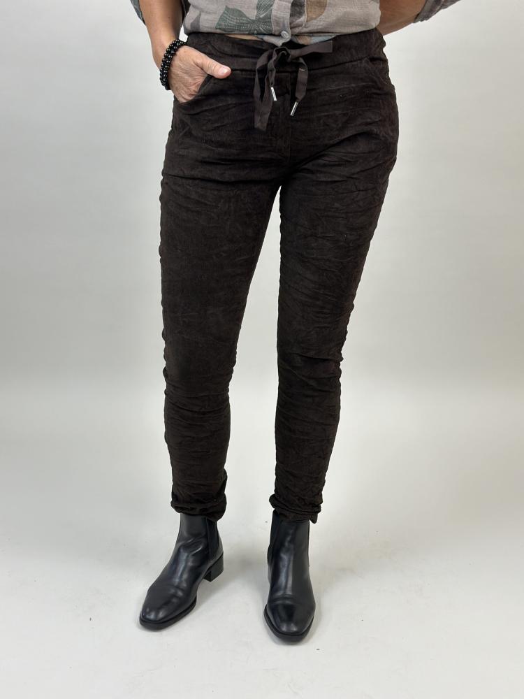 Stretchiga och sköna mörkbruna manchesterbyxor med resår i midjan och fickor fram & bak.