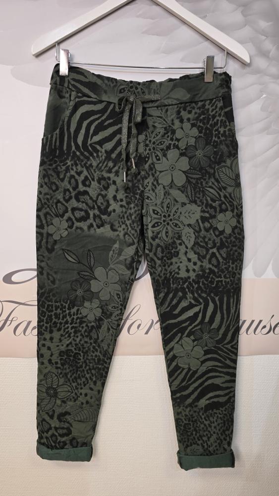 Fantastiskt sköna byxor - med mycket stretch, Armygröna med print av löv, blommor och animalprint