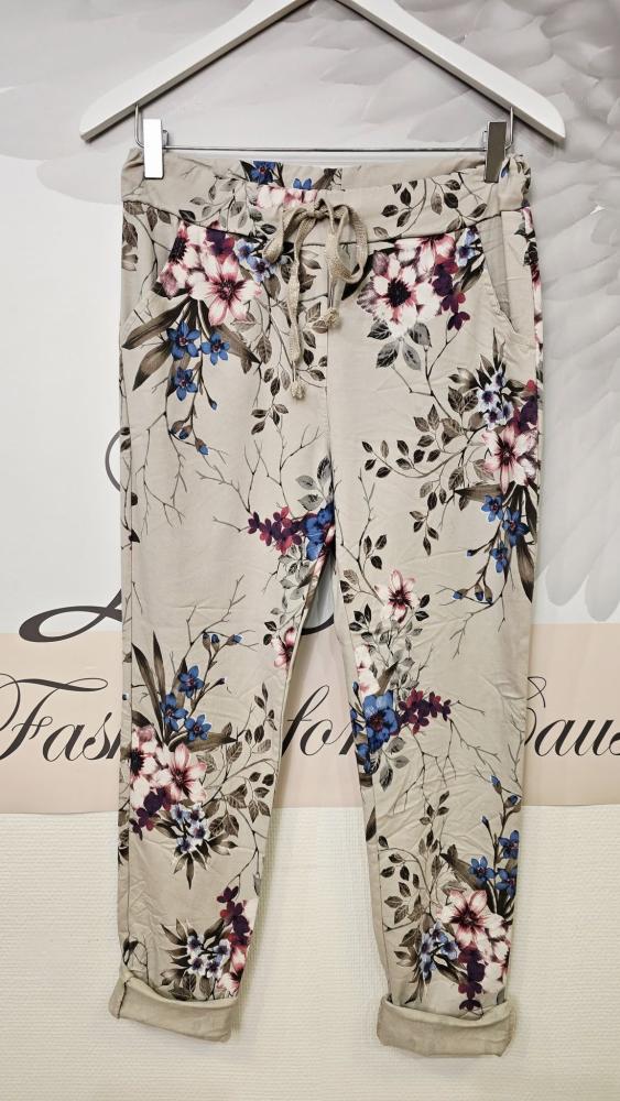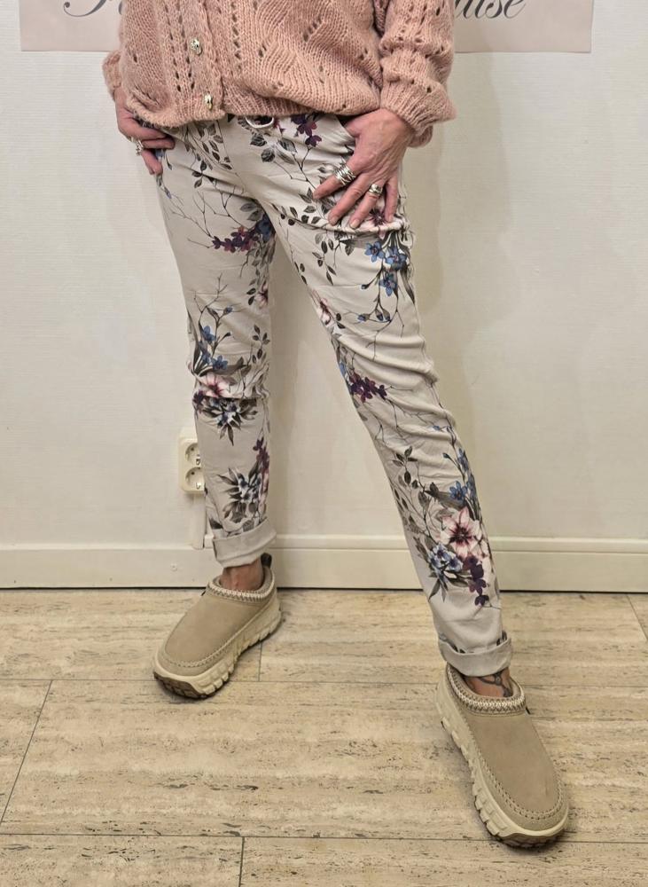 Fantastiskt sköna byxor - med mycket stretch, Beige med blommor i blått och plommon