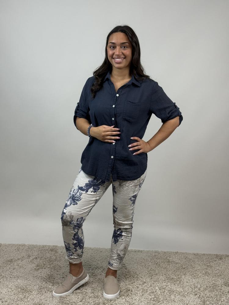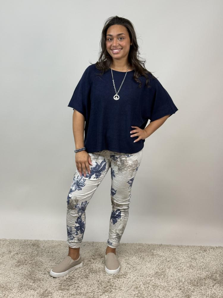Magiskt stretchig byxa, Beige med blå blommor, Signe - Mix by Heart