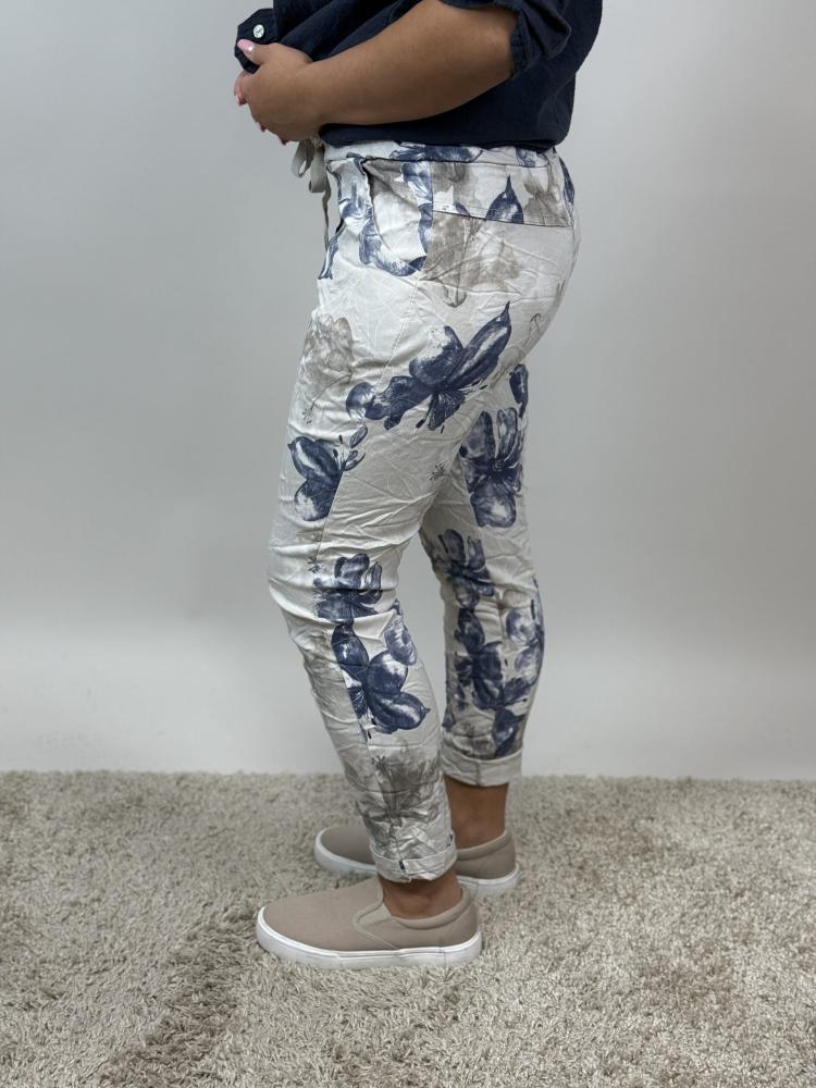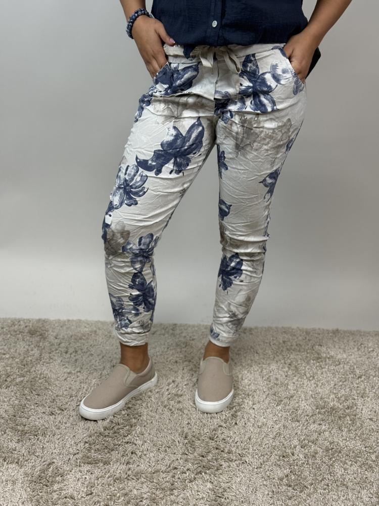 Våra storsäljare! Supersköna stretchiga byxor med resår i midjan samt fickor fram. Stora blå blommor på beige botten, samt taupefärgade detaljer och smala vita siluetter.