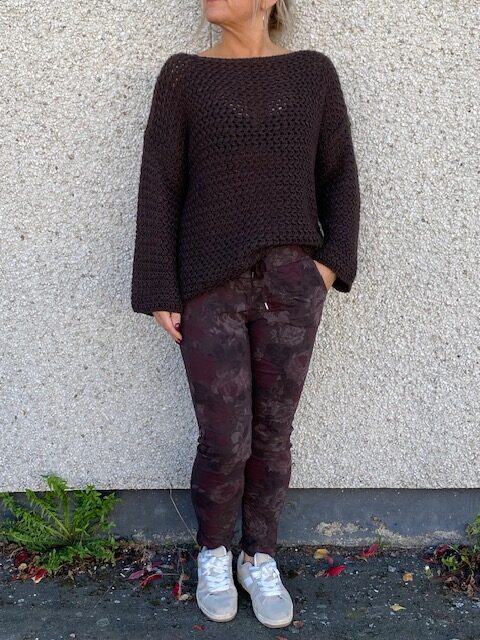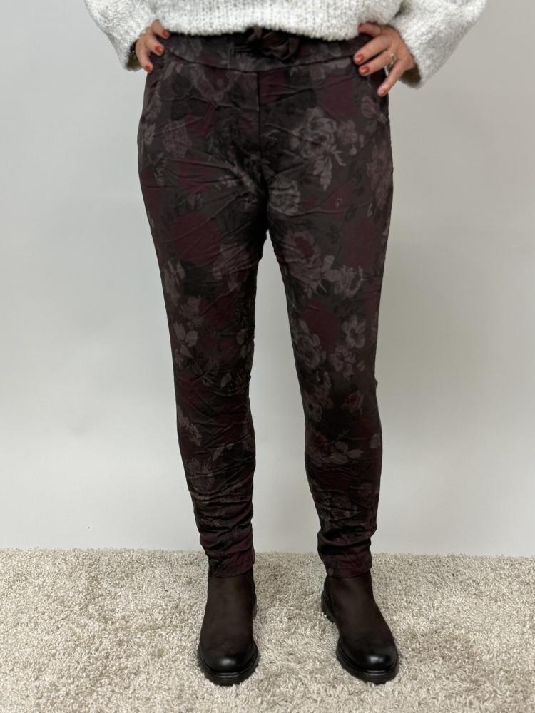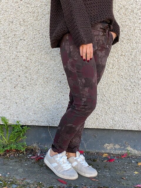 Våra storsäljare! Supersköna bruna stretchiga byxor med mönster i vinrött. Resår i midjan, fickor fram och bak.