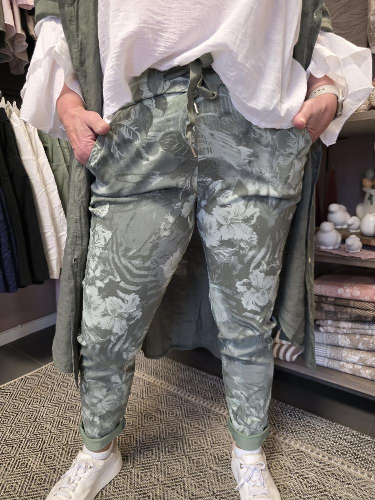Blad- och blommönstrad byxa i olika gröna toner.