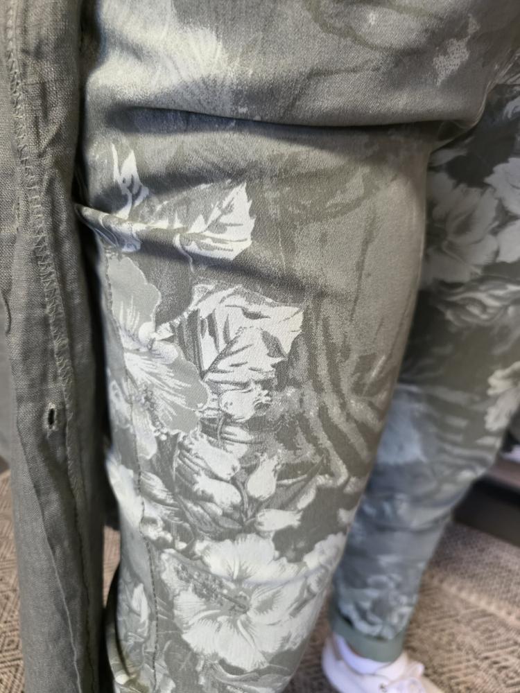 Fantastiskt sköna byxor - med mycket stretch, Blomprint på grön botten