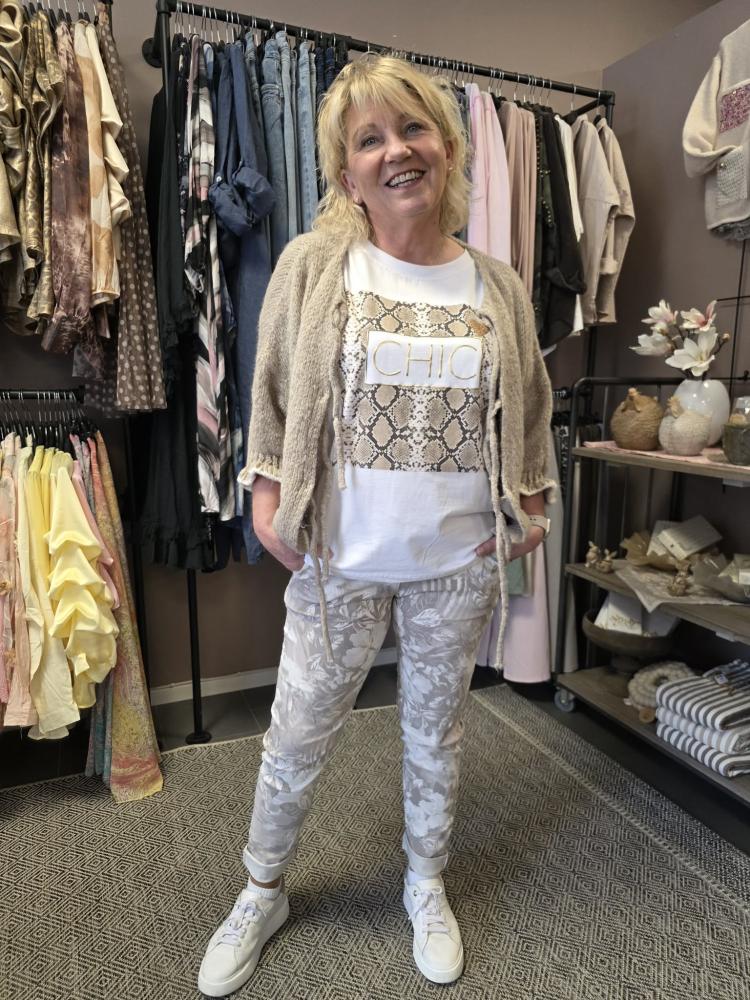 Fantastiskt sköna byxor - med mycket stretch, Blomprint på sandfärgad botten