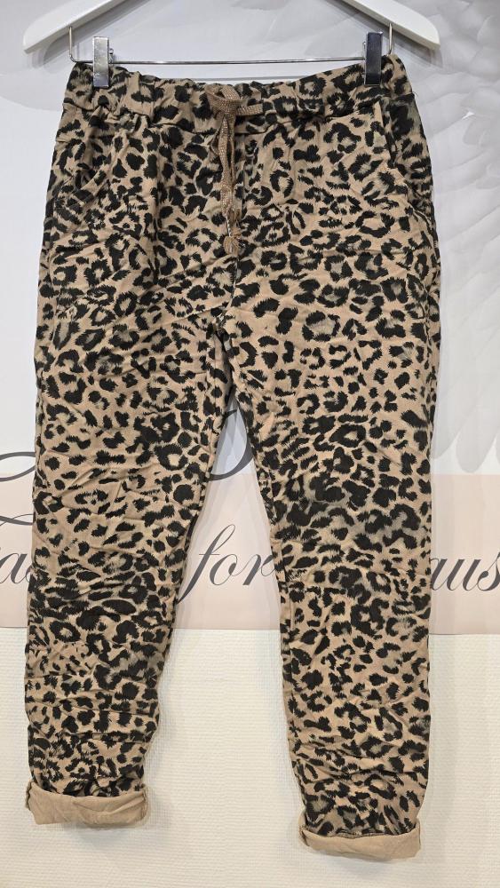Fantastiskt sköna byxor - med mycket stretch, Kamelfärgade med leoprint