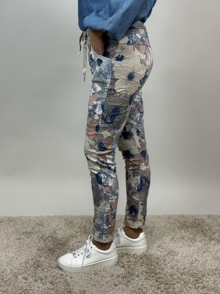 Våra storsäljare! Supersköna stretchiga byxor med resår i midjan, fickor fram och bak. Diffusa blommor i beige, taupe, blått och lite rosa.