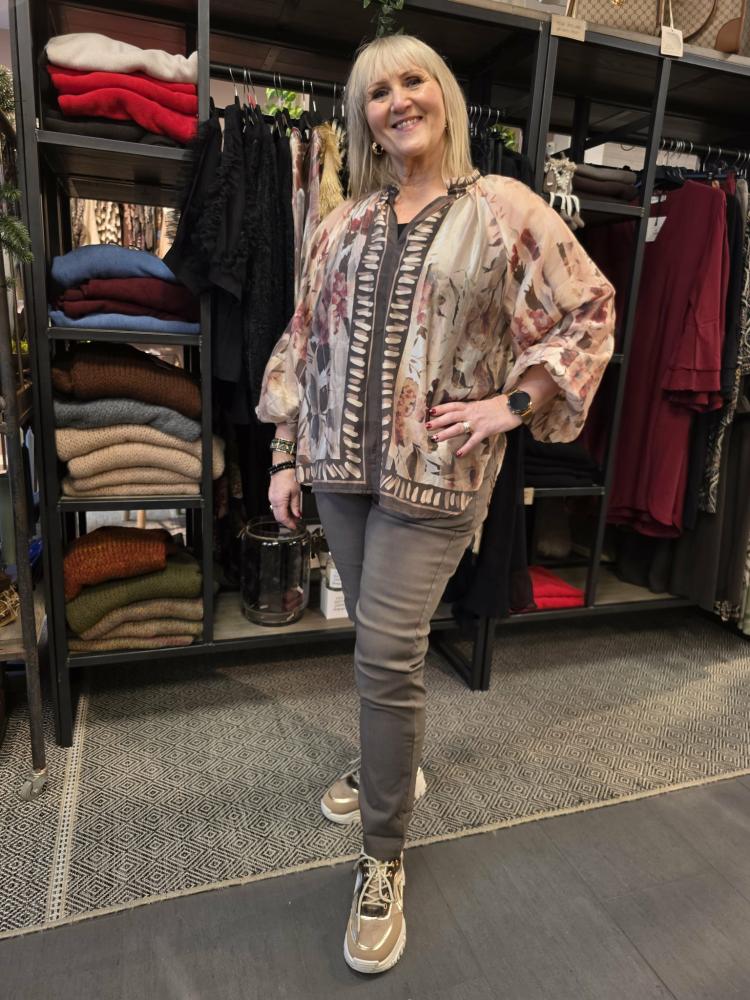 Stretchig taupefärgad byxa med resår och dragsko i midjan samt fickor fram. Otroligt omtyckt modell som passar de allra flesta.