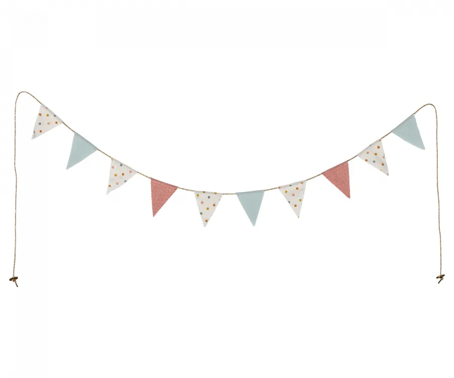 - Färgglada Flaggor: Girlangen har 10 färgglada flaggor gjorda i Maileg-tyg, vilket ger en mysig och varm känsla till rummet.