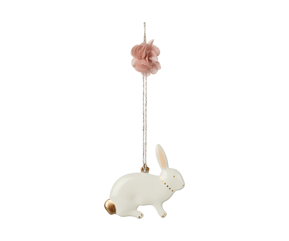 Rosa påskkanin i metall från Maileg med handmålade detaljer och pompomboll. Perfekt att hänga i påskris eller dekorera påskbordet med.