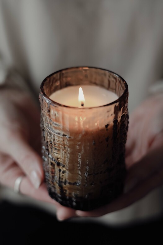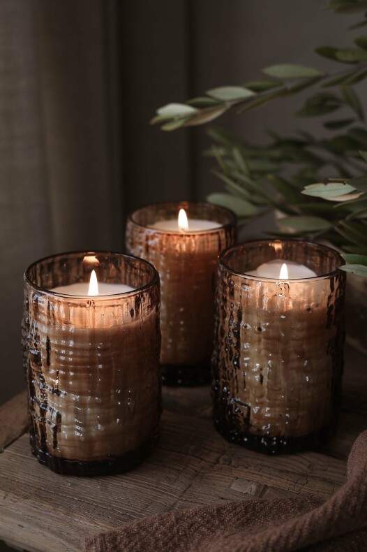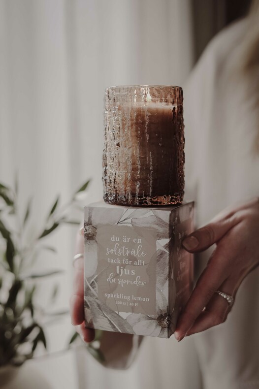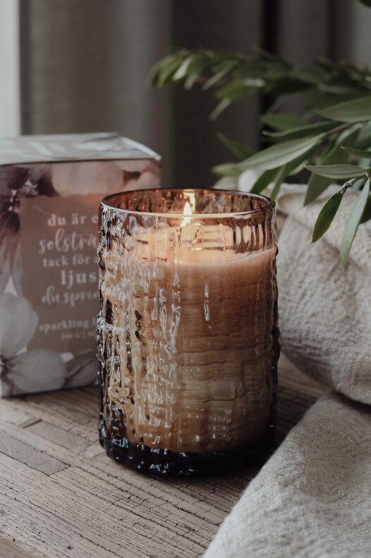 Doftljus i vacker brun mönstrad glasburk, som är fin att återanvända även sedan ljuset brunnit ner. Kommer i fin gåvoask.