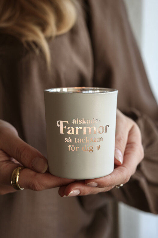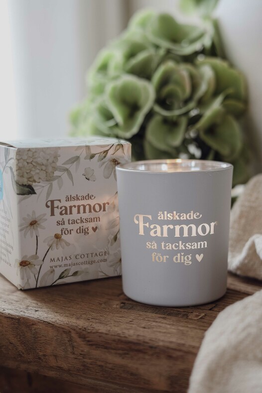 Vit matt ljuslykta med text: Älskade farmor så tacksam för dig