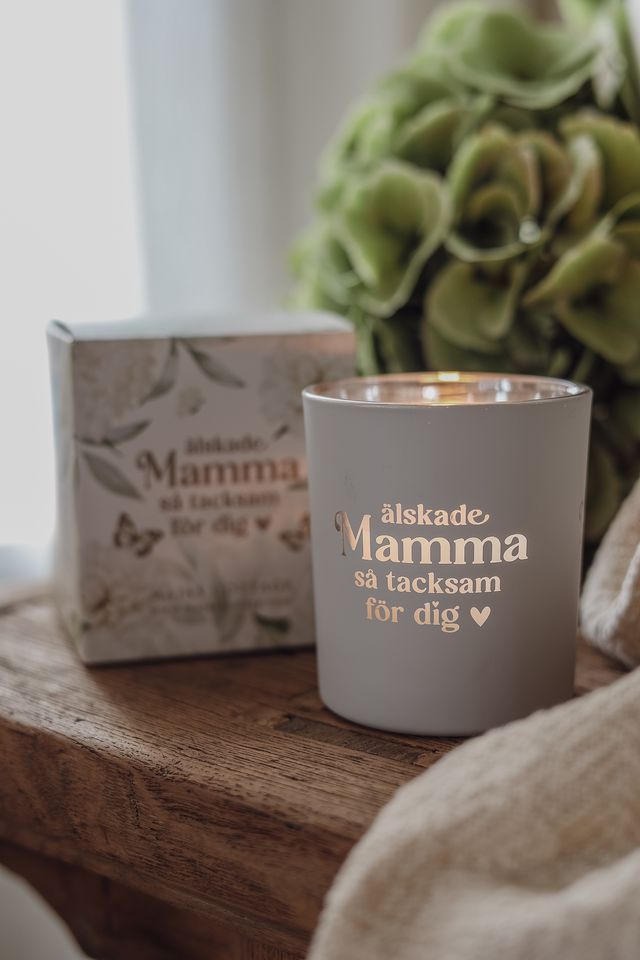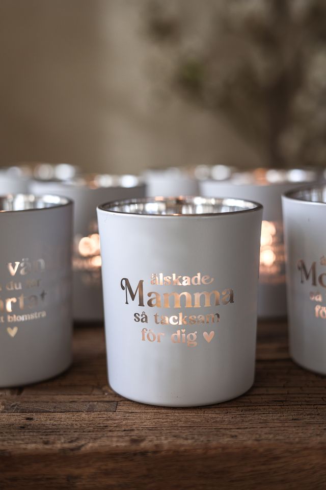 Vit matt ljuslykta med text: Älskade mamma så tacksam för dig