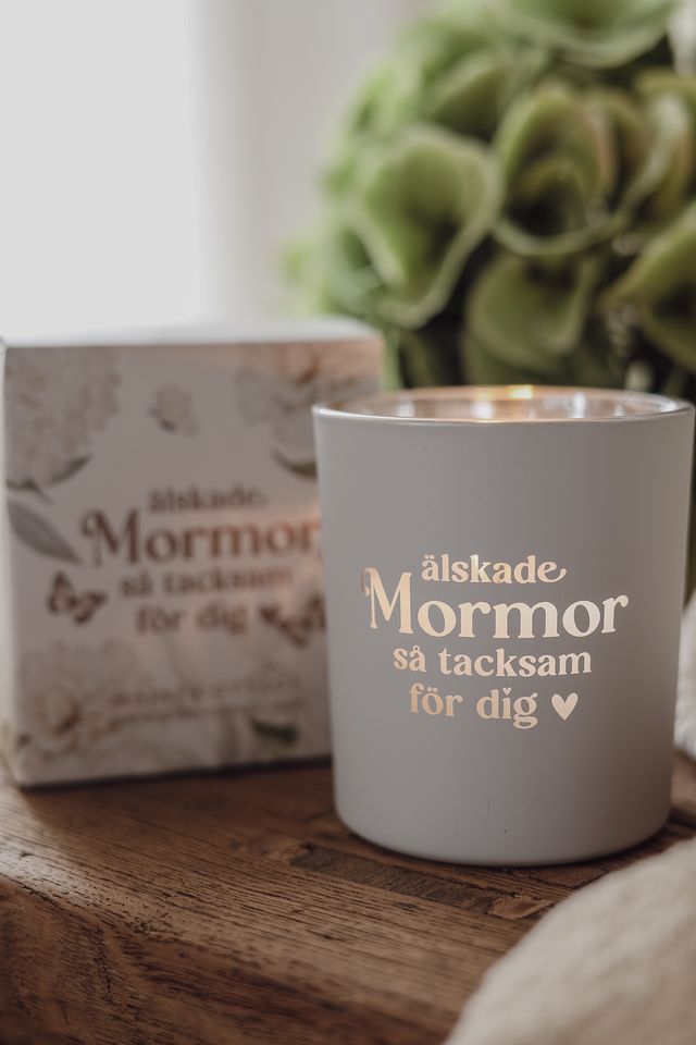 Vit matt ljuslykta med text: Älskade mormor så tacksam för dig