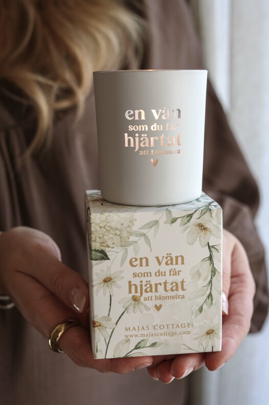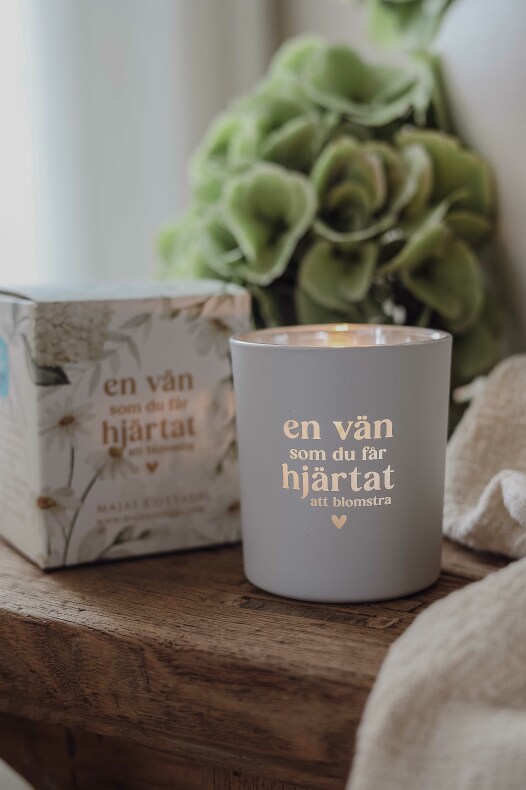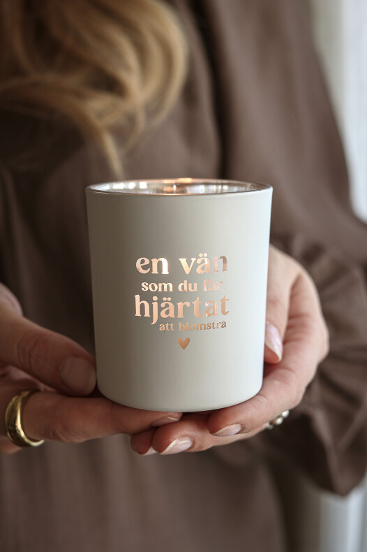 Vit matt ljuslykta med text: En vän som du får hjärtat att blomstra