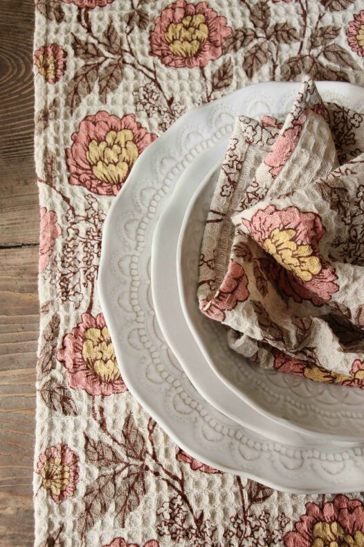 Vacker löpare i textil med motiv av blommor och blad i dova, dämpade toner