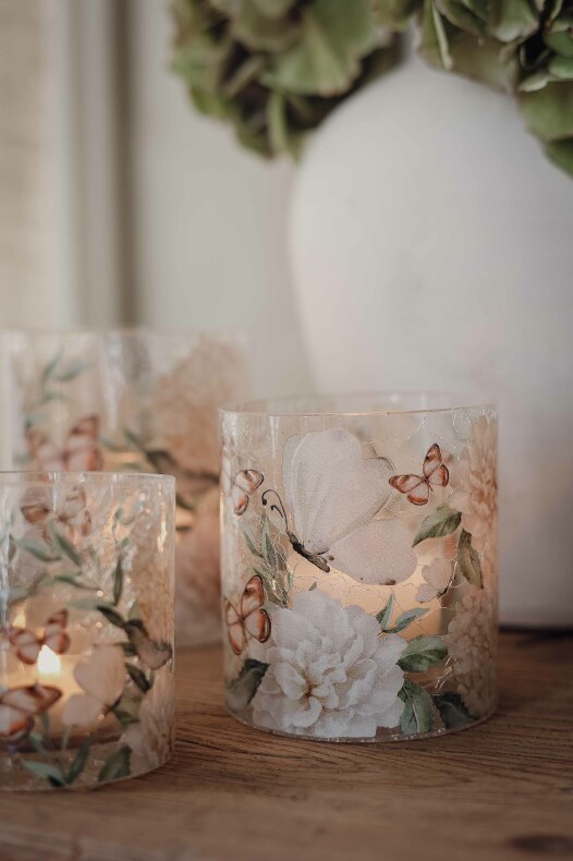 Majas Lykta Hortensia & Butterflies är en vacker och stämningsfull glaslykta som sprider ett mjukt och behagligt sken. Det krackelerade glaset tillsammans med mönstret av hortensior och fjärilar ger en varm och levande känsla som passar lika fint på matbordet som i fönstret eller på ett sidobord. Eftersom varje lykta är handgjord får varje exemplar sin egen unika karaktär.