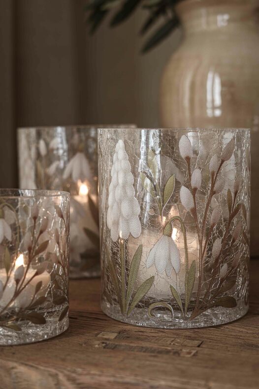 Handgjord lykta i krackelerat glas, med mönster av söta pärlhyacinter, videkvistar och snödroppar.