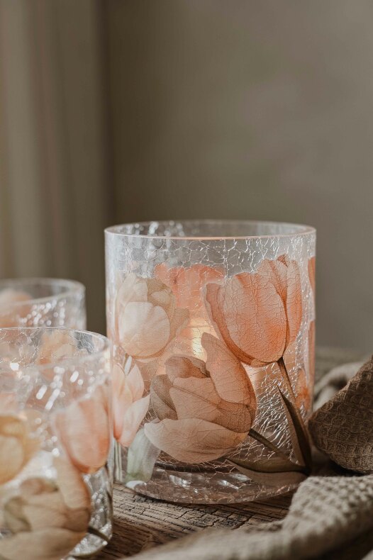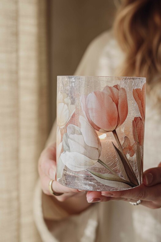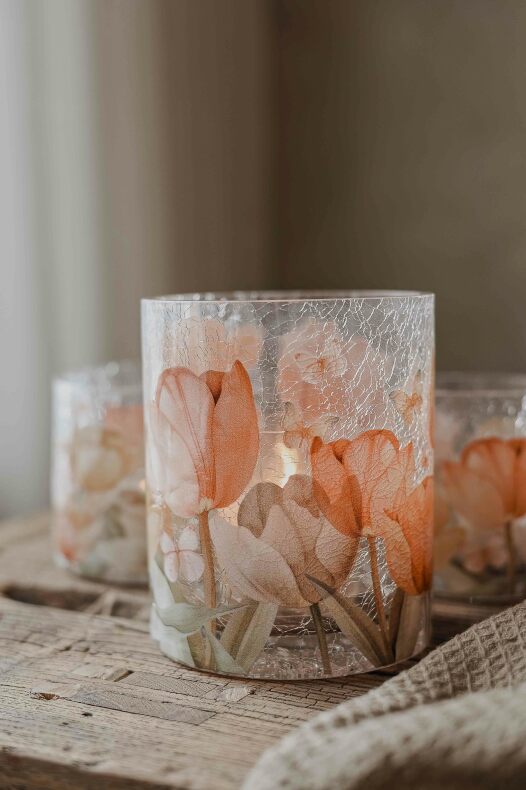 Handgjord lykta i krackelerat glas, med mönster av söta tulpaner