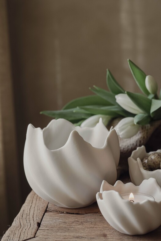 Handgjord skål / lykta i vit matt finish i form av ett äggskal