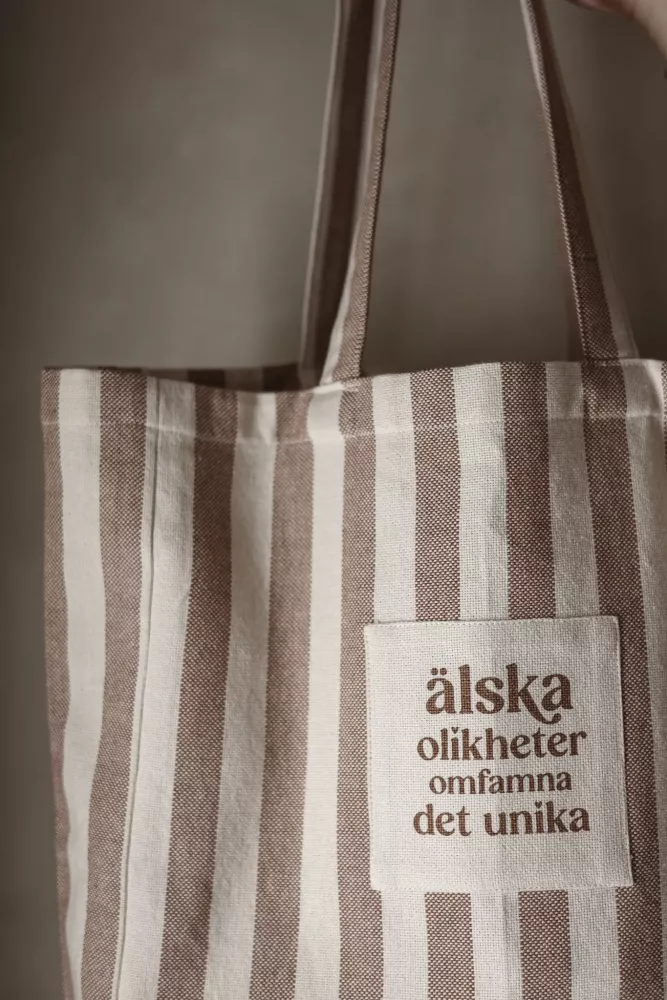 En fin tygpåse med texten ”Älska olikheter”, skapad för att påminna om medmänsklighet, respekt och allas lika värde. En praktisk påse med ett viktigt budskap.