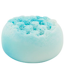 Tvål och tvättsvamp i ett. Tvättsvampen är fylld med väldoftande tvålmassa.