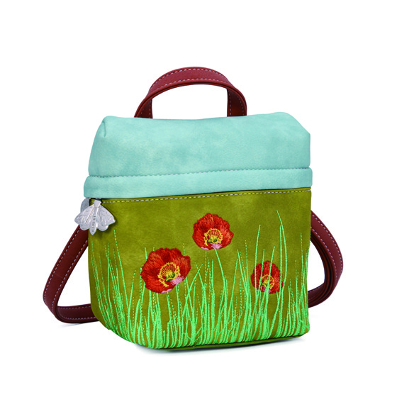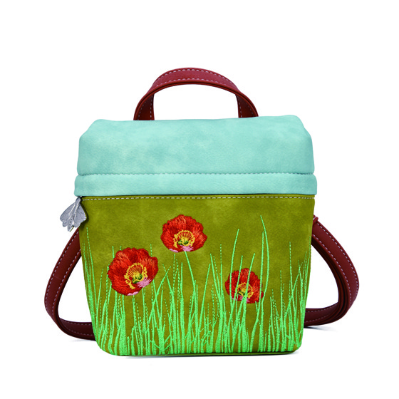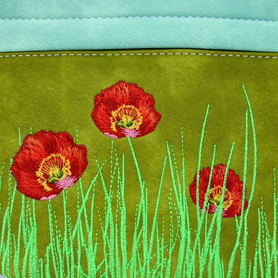 En nätt hand- och axelremsväska i grönt och blått med vackert broderade vilda blommor. En lätt och mångsidig liten väska som passar lika bra till kväll som till vardag.