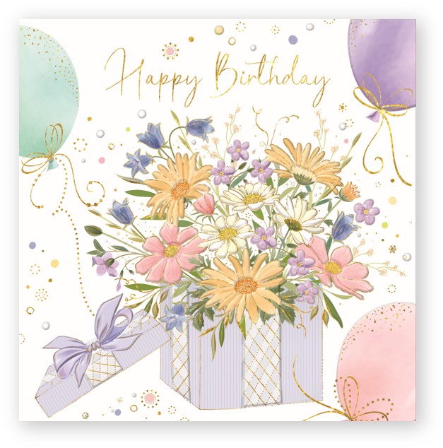 Dubbelt kort med vacker struktur, präglat tryck av en present fylld med blommor i härligt mjuka toner, samt några pastellfärgade ballonger runt om. Detaljer i guld, samt guldfärgad text: Happy Birthday.