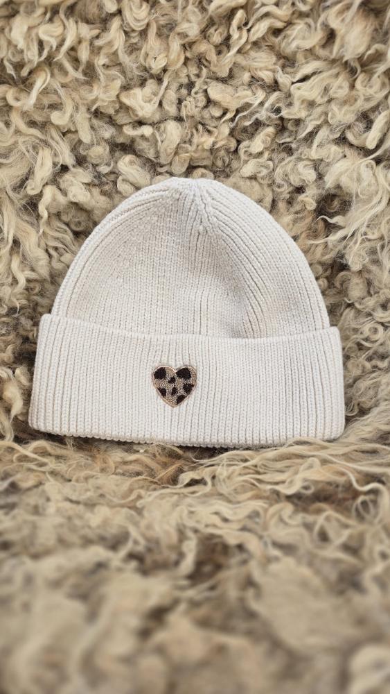 Snygg offwhite mössa med ett hjärta fram i leoprint
