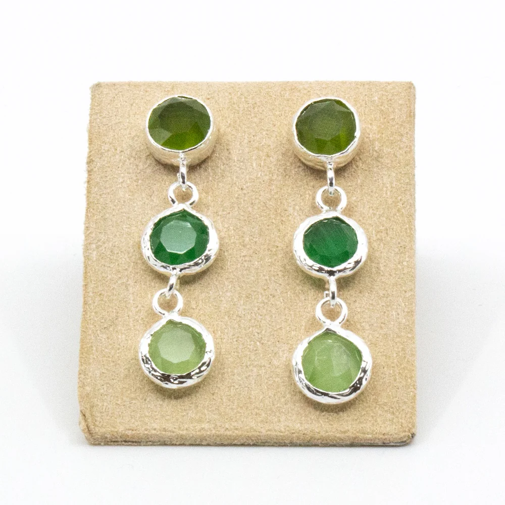 Vackra örhängen med 3 stenar hängande på rad. Stenar i gröna nyanser, infattade i silverplätering.