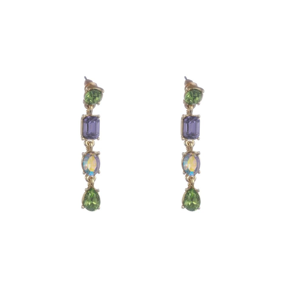 Hängande örhängen, fyra fasetterade stenar i olika former och färger - som hänger på rad.
