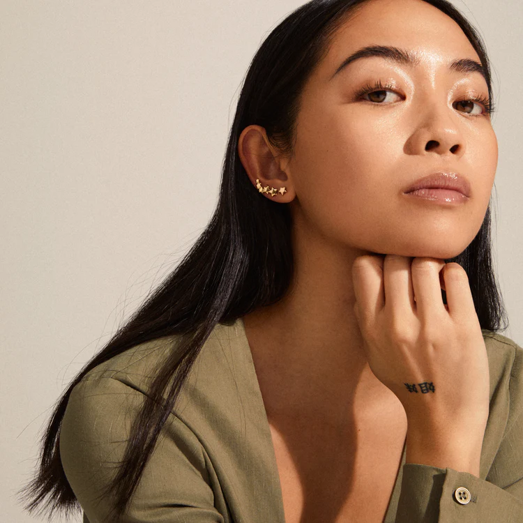 När du önskar dig en stjärna spelar ingen roll vem du är. Oemotståndliga guldpläterade örhängen med asymmetrisk stjärndesign. Den ena är en diskret liten dubb, den andra ett stjärnfall som kröker sig upp längs örat. En uppsättning örhängen som passar till allt och som snart kommer att bli din nya favoritaccessoar.