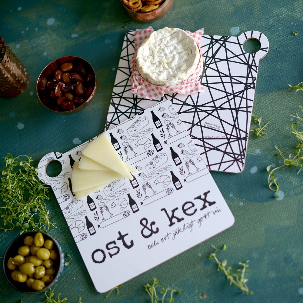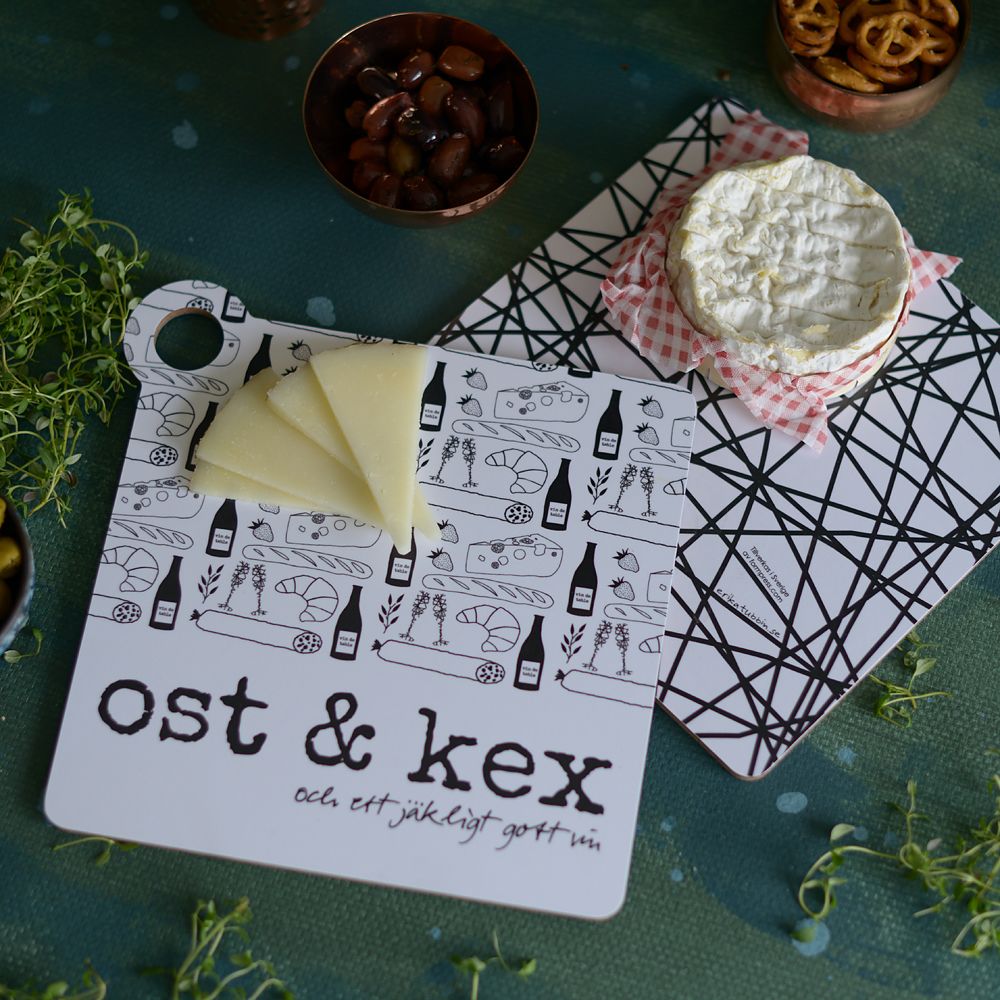 Vändbart ostbricka/grytunderlägg med text "ost & kex och ett jäkligt gott vin" på ena sidan och med trassligt mönster på den andra.