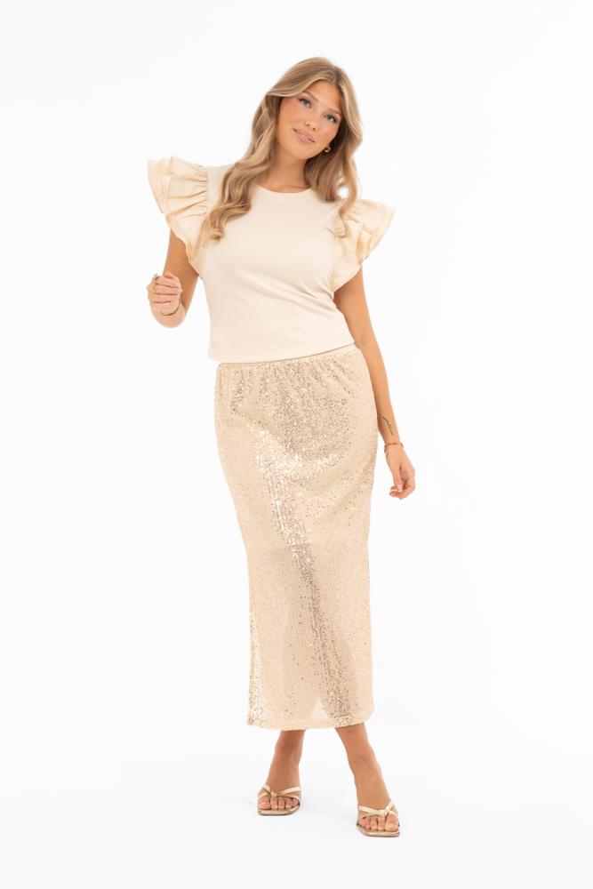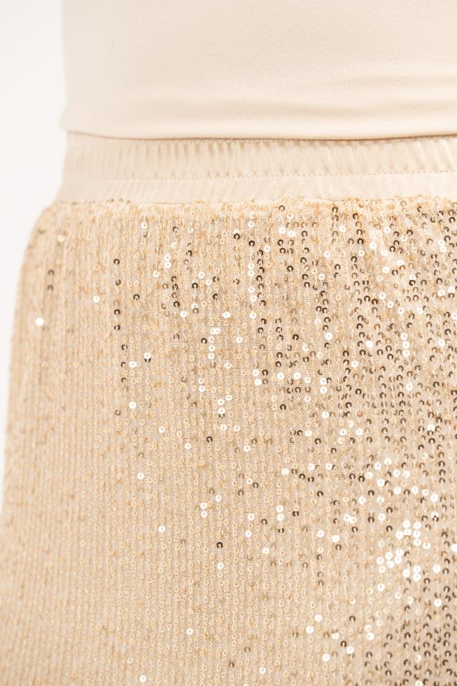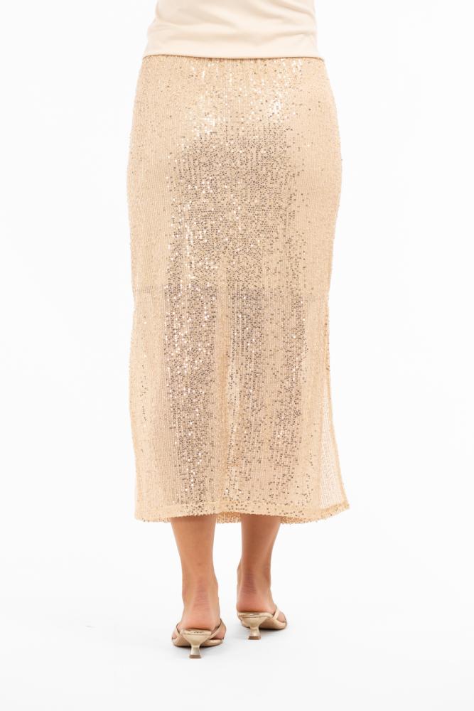 Kjol med paljetter med ljus guldlyster. Slitsar i sidorna och satinkant i midjan - Stl S-XXL