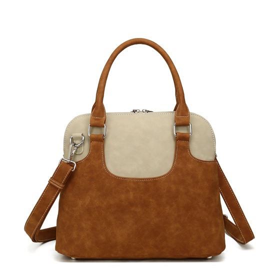 En generös hand- och axelremsväska i cognac och beige med broderi av en rödhake framtill. En stilfull väska som kombinerar gott om plats, smart förvaring och ett mjukt, personligt uttryck.