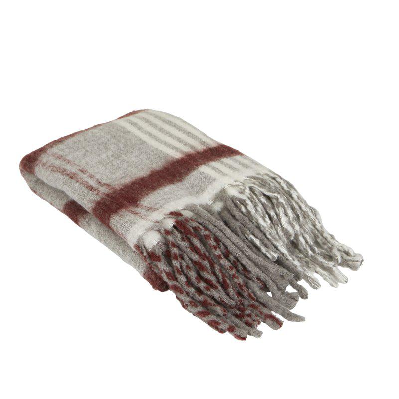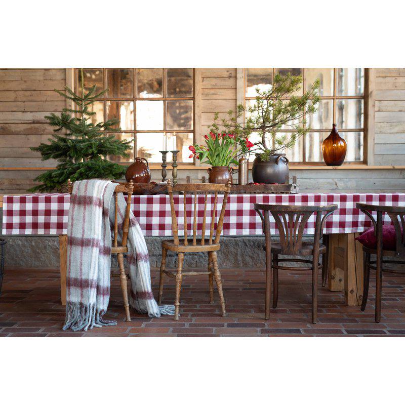 Filt att mysa med i soffan med en god bok eller bra serie på TV. Julfin med sina mörkt röda rutor på vintervit botten. Tillverkad i ull och akryl. Ullen ger en naturlig värme och en lite lyxig känsla, akrylfibrerna gör att pläden behåller sin form och mjukhet.