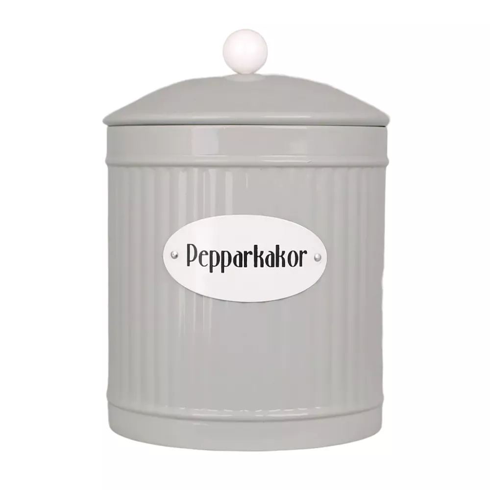 Burk i plåt med lock och en liten fin skylt med texten pepparkakor. Perfekt till julbordet