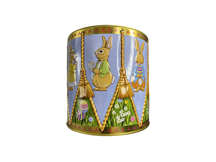 Söt kakburk med lock i plåt med harar och ägg - extra festlig att fylla med godis.