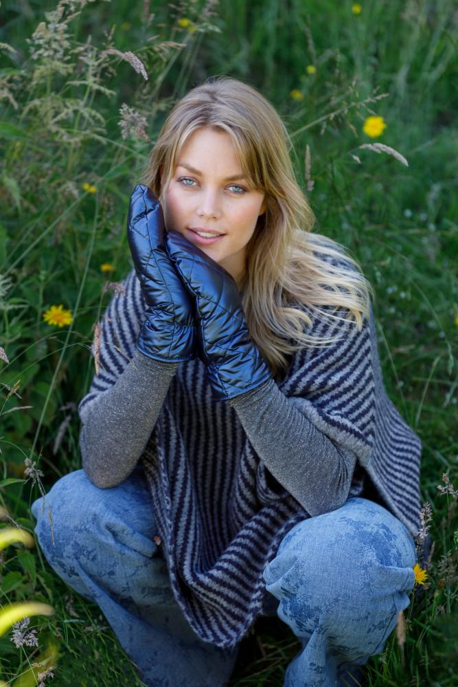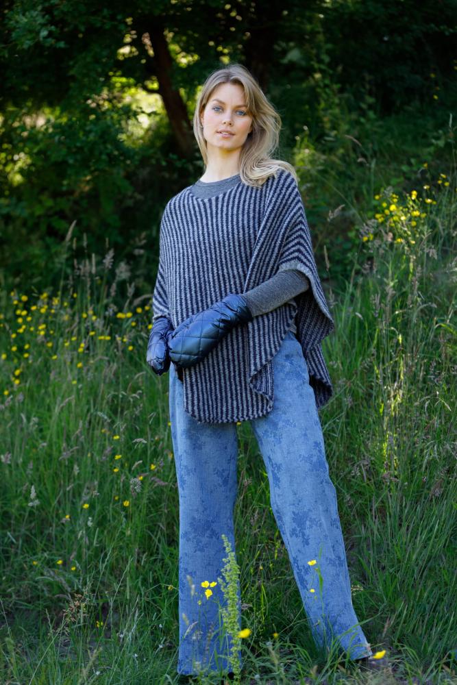 Härlig poncho, smalrandig i grått och mörkblått. Öppen i sidorna.